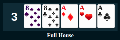 A full house, also known as a full boat or a boat is a hand that contains three cards of one rank and two cards of another rank.
