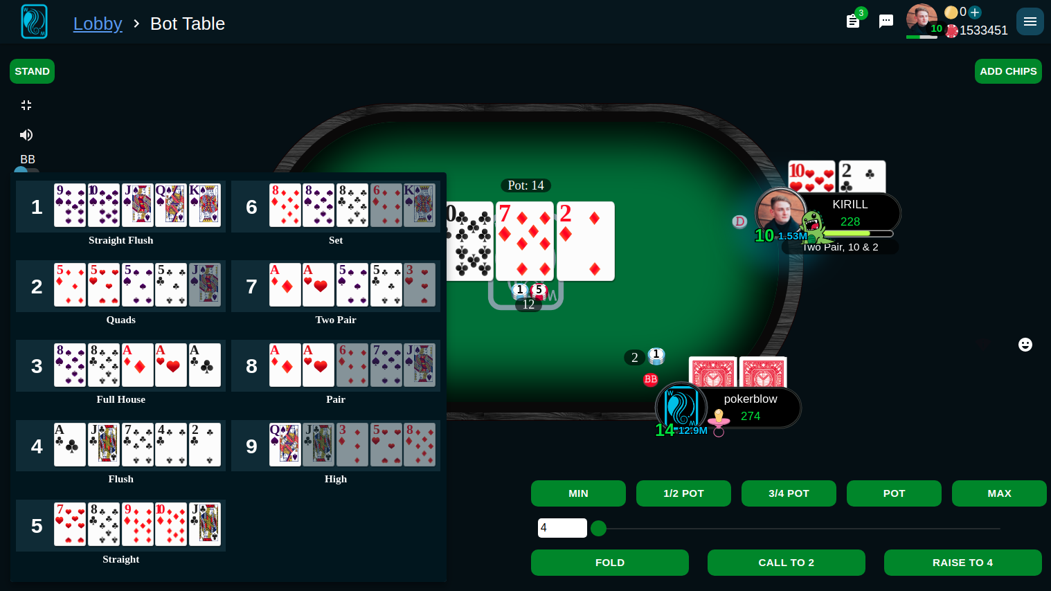 In case, you're playing on our site, you can look up the combinations by hovering over the Cards icon. It's on the left of your screen.