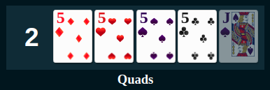 Quads, also known as four of a kind, is a hand containing four cards of the same rank and one card of a different rank (kicker).