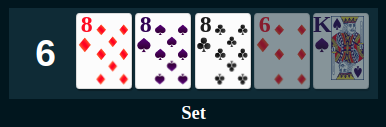 Three of a kind, also known as trips or a set, is a hand that contains three cards of one rank and two cards of two other ranks (the kickers).